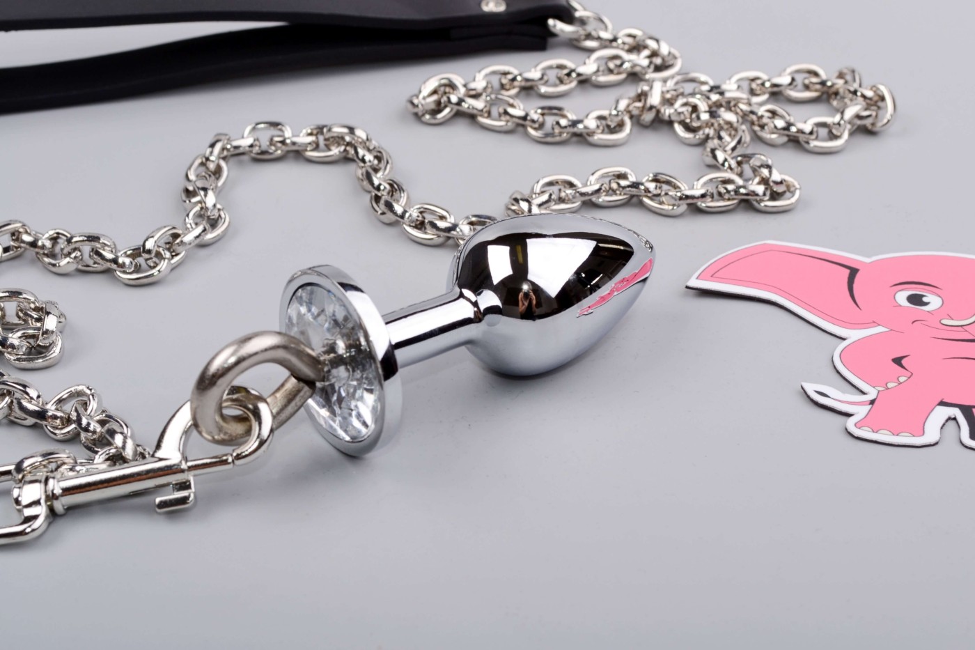 Az anális dugó alumínium anyaga olyan sima tapintású, mint az üveg. A hideg lánc póráz műbőr hurokkal kiemeli a dominanciát.
