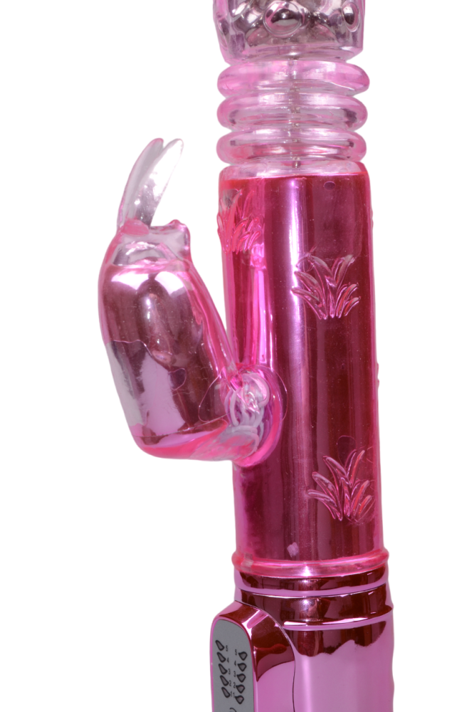 A nagy, mélyrózsaszín gyöngyökkel díszített vibrátor lenyűgöz a csiklóra vetített dizájnjával. Úgy néz ki, mint egy nyuszi, hosszú fülekkel. Szeme és pofa is van. Ugyanakkor a játék testén fűcsomókból álló műanyag mintát talál. A felső átlátszó rész felfedi, mi rejtőzik a vibrátor belsejében. A fényes fogantyú megemelt kezelőpanellel jól illeszkedik a kézbe a készülék hátulján található ujjhornyoknak köszönhetően. A játék egyenes, lecsavarható alja szilárd alapot képez a vibrátornak. Ezért elhelyezheti az éjjeliszekrényen vagy a padlón. A burkolat ugyanakkor ügyesen elrejti az USB-kábel lyukát. Összességében a játék erőteljesnek, ugyanakkor játékosnak és modernnek tűnik.