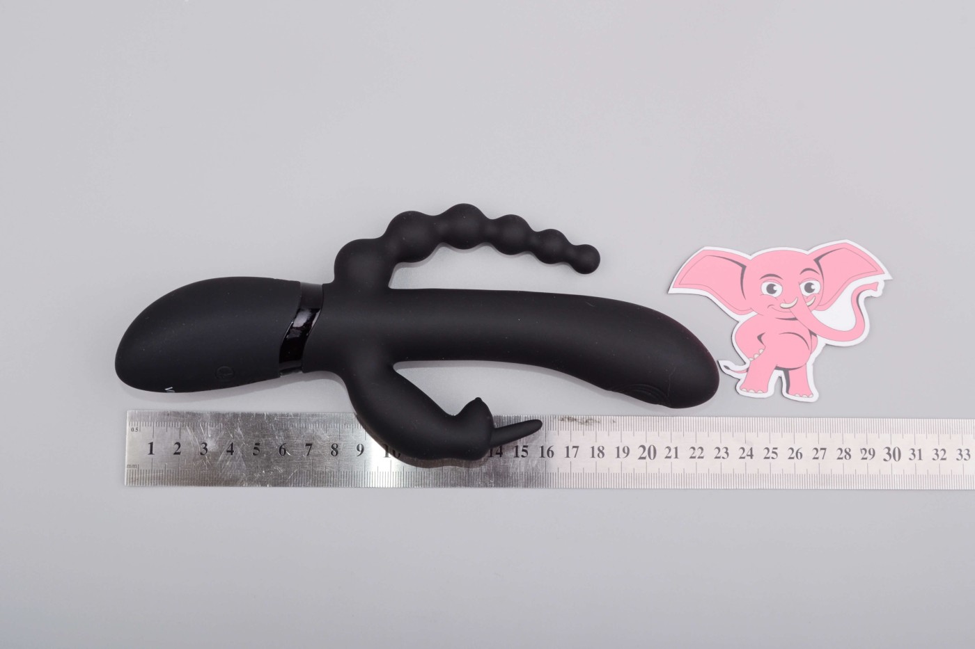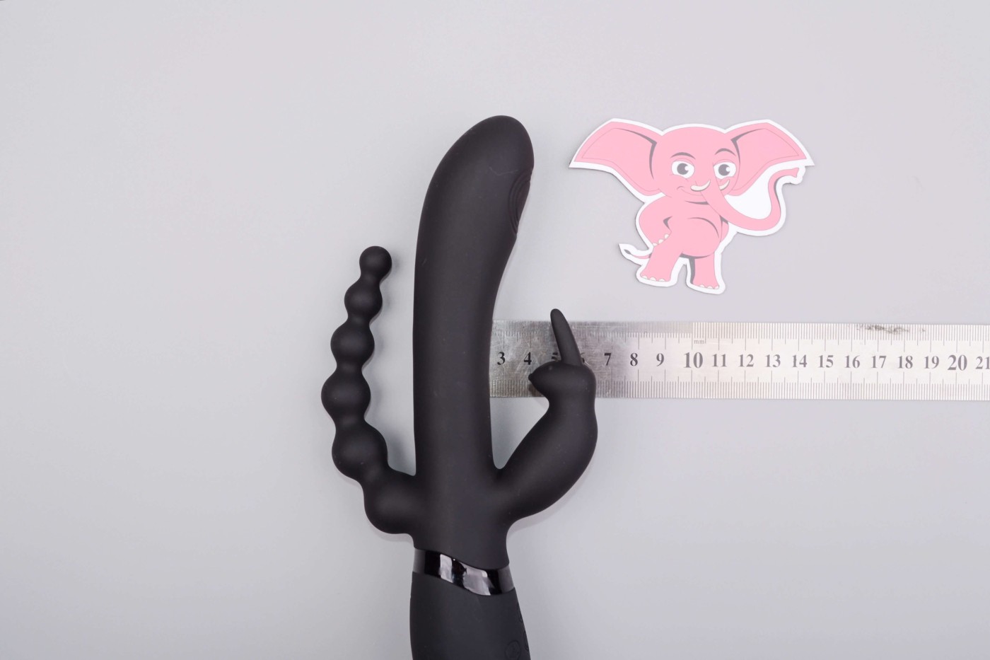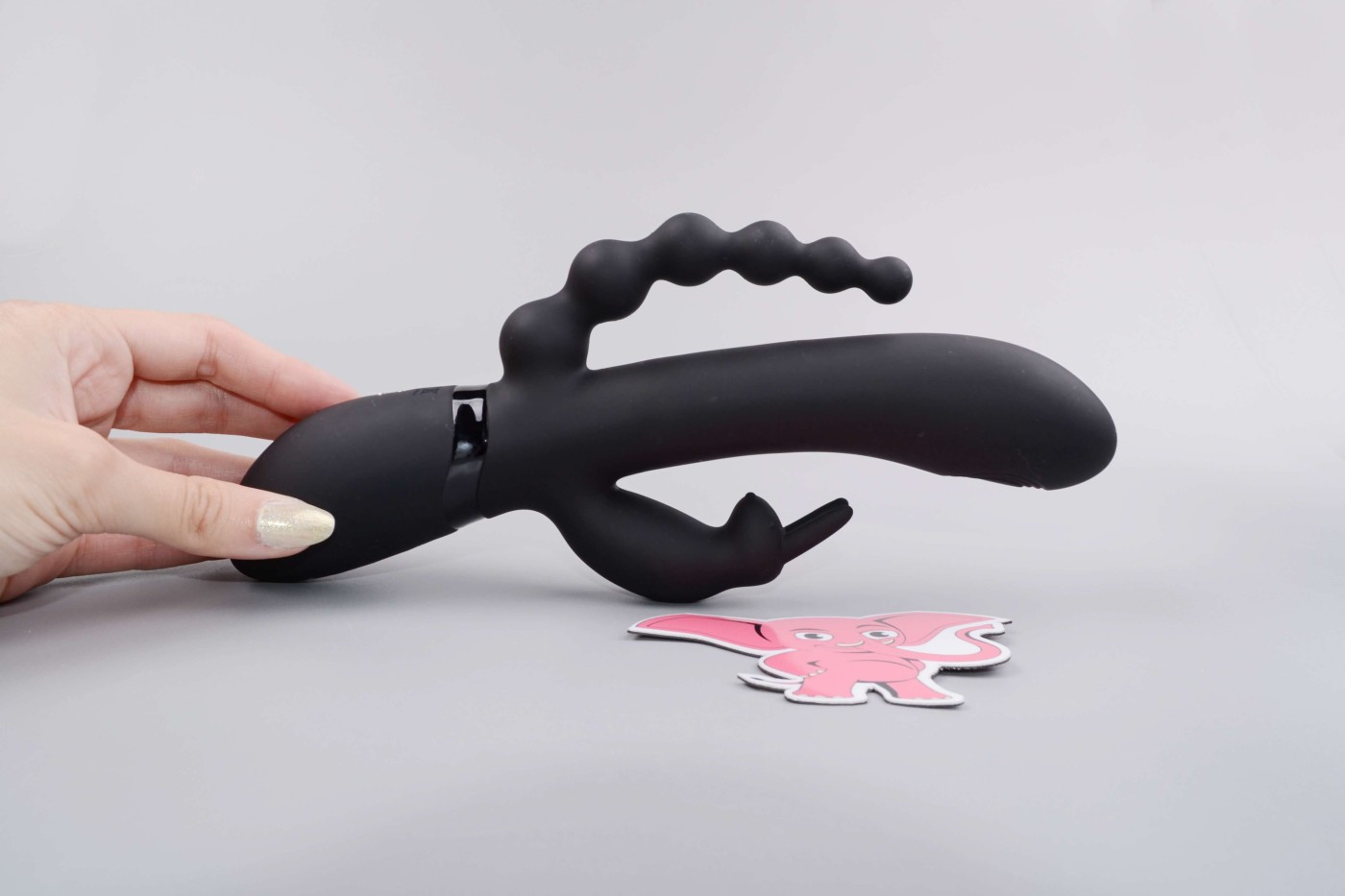 Az elegáns fekete vibrátor első pillantásra kicsit háromágúnak tűnik. A klasszikus, hosszú, ovális és enyhén ívelt hüvelyrész csúcsán egy speciális pulzáló pont található a G-pont maximális stimulációja érdekében.A füles nyúl formájú kitüremkedése aranyos részleteivel örvendeztet meg két darab formájában kicsi szemek és pofa. Hat golyóval ellátott anális gyöngyök kényelmesen behelyezhetők az aljába játék közben, vagy egyszerűen csak masszírozzák a perineumot. Összességében a vibrátor rugalmas és rugalmas. Ezért jól tart a kézben, és könnyen beilleszthető az ölébe.
